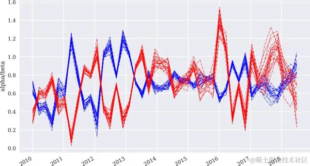 图13-22表现的是估算值的一个子集,说明回归参数alpha和beta随时间演变: