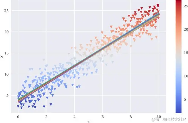 贝叶斯回归的一个要素是(马尔科夫链)蒙特卡洛(MCMC)采样[6]。原则上,这和前一个例子中多次从盒子取出球相同——只是采用更系统性、更自动化的方式。