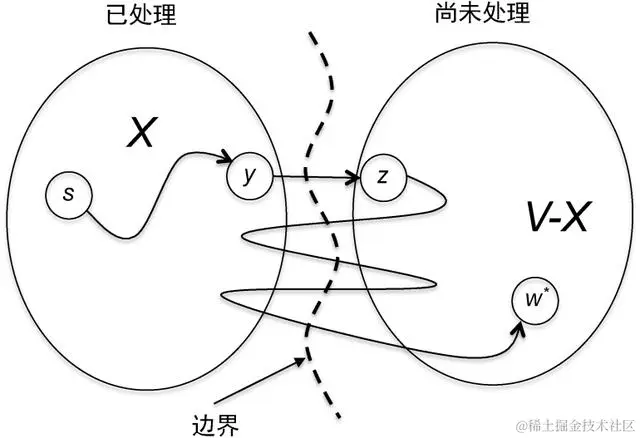 我们随意选择一条s−w*的竞争路径P' 。我们对P' 所知甚少。但是,我们知道它源于s,终于w*。在迭代之初,s属于集合X但w*不属于X。由于它是从X中开始并在X之外结束,因此路径P' 跨越了X和V−X的边界1次(图3.6)。设(y, z)表示跨越边界的P' 的第1条边(y∈X且z∉X)。[7]