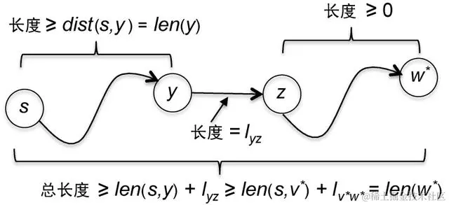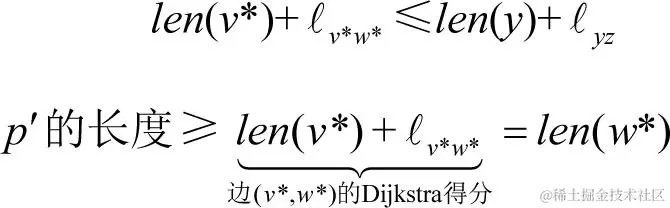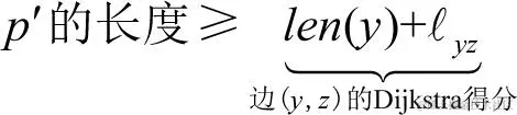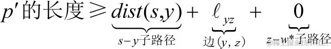 为了论证P' 的长度不会小于len(w*),我们独立地考虑它的3个片段:P' 从s到y的起始部分、边(y, z)以及从z到w*的最终部分。起始部分不可能短于从s到y的最短路径,因此它的长度至少是dist(s, y)。边(y, z)的长度是