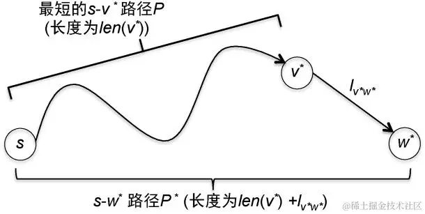 图3.5 在s−v*最短路径的末尾添加边(v*, w*),产生一条s到w*的最短路径P*,其长度为len(v*)+