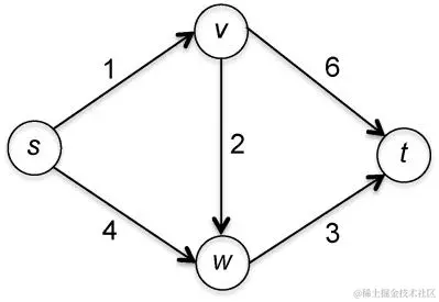 =0+4=4。由于前者的得分更低,因此它的头顶点v就被添加到X中,并且len(v)被赋值为边(s,v)的Dijkstra得分,其值为1。在第2次迭代时,X={s,v},有(s,w)、(v,w)和(v,t)共3条边可以扮演(v*,w*)的角色。它们的Dijkstra得分分别是0+4=4、1+2=3和1+6=7。由于(v,w)具有最低的Dijkstra得分,因此w被添加到X中,len(w)被赋值为3((v,w)的Dijkstra得分)。我们已经知道哪个顶点会在最后一次迭代中被添加到X(唯一未被处理的顶点t),但仍然需要确定它是因为哪条边而被添加(为了计算len(t))。由于(v,t)和(w,t)的Dijkstra得分分别是1+6=7和3+3=6,因此len(t)被设置为较小的值6。现在,集合X包含了所有的顶点,不再有任何边从X跨越到V−X,因此算法就宣告结束。len(s)=0,len(v)=1,len(w)=3,len(t)=6这几个值与我们在小测验3.1中所验证的真正最短路径的长度是匹配的。