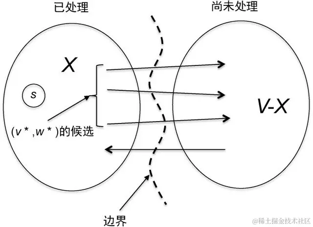 图3.2 Dijkstra算法的每次迭代处理一个新顶点,即一条从X跨越到V−X的边的头顶点