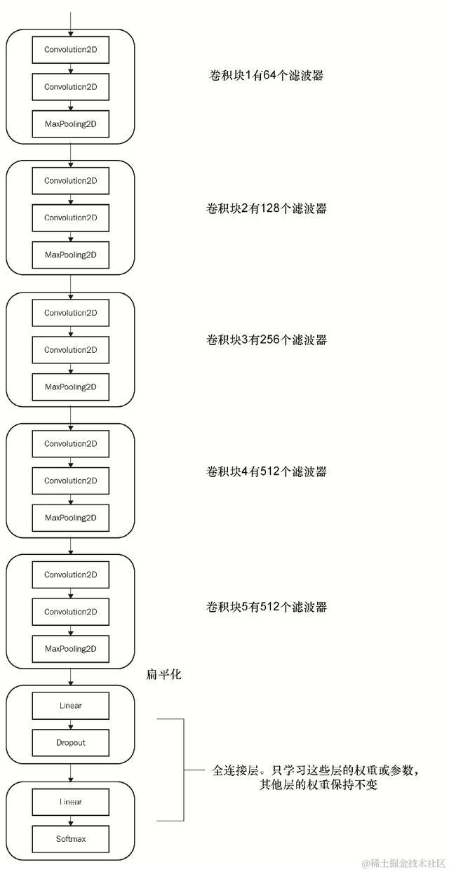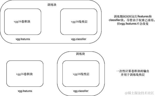 第一个框描述了一般情况下如何进行训练,这可能很慢,因为尽管值不会改变,但仍为每轮计算卷积特征。在底部的框中,一次性计算卷积特征并仅训练线性层。为了计算预卷积特征,我们将所有训练数据传给卷积块并保存它们。为了实现这一点,需要选择VGG模型的卷积块。幸运的是,VGG16的PyTorch实现包含了两个序列模型,所以只选择第一个序列模型的特征就可以了。以下代码执行此操作: