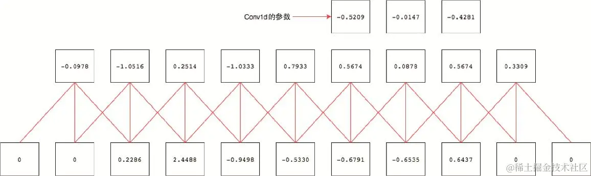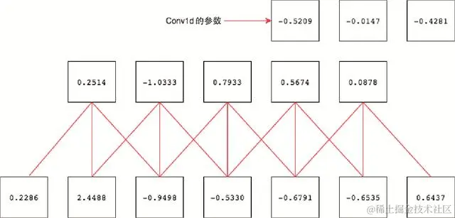 底部框表示7个值的输入张量,连接框表示应用3个卷积滤波器后的输出。在图像的右上角,3个框表示Conv1d层的权重和参数。卷积滤波器像窗口一样应用,并通过跳过一个值移动到下一个值。要跳过的值称为步幅,并默认设置为1。下面通过写下第一个和最后一个输出的计算来理解如何计算输出值: