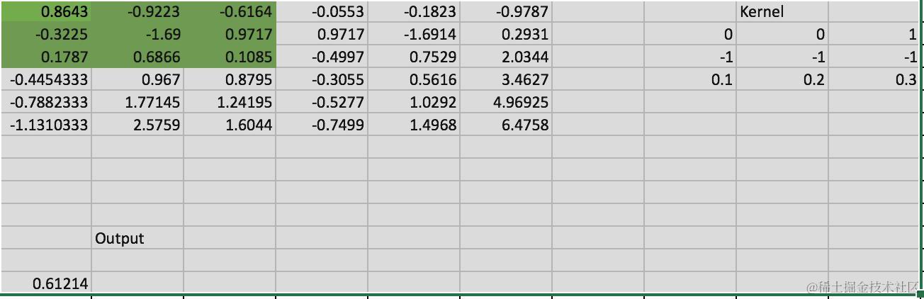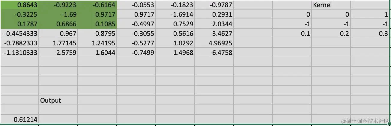 在图5.7中,假设用6×6矩阵表示图像,并且应用大小为3×3的卷积滤波器,然后展示如何生成输出。简单起见,我们只计算矩阵的高亮部分。通过执行以下计算生成输出: