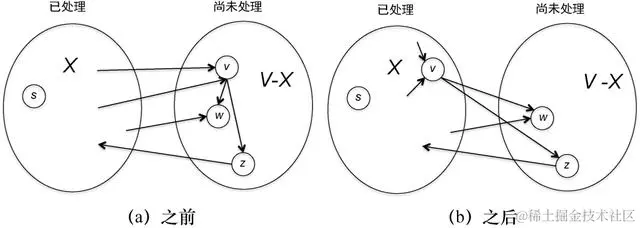 图4.3 当一个新顶点v从V−X移动到X时,从v出发的边可能成为跨越边界的边