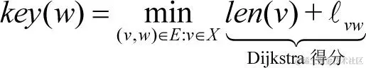 顶点w∈V−X的键是一条尾顶点为v∈X且头顶点为w的边的最低Dijkstra得分(如果不存在这样的边,则是+∞)。