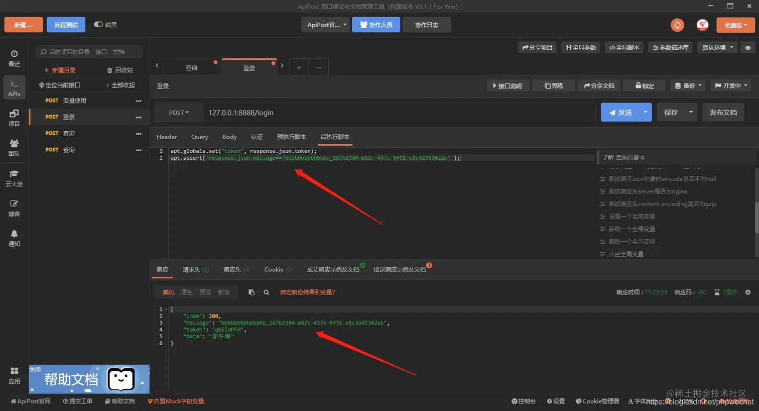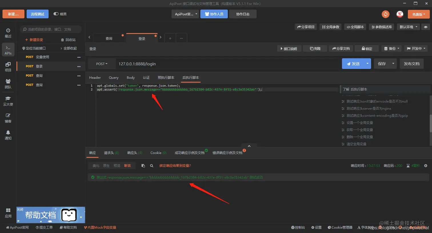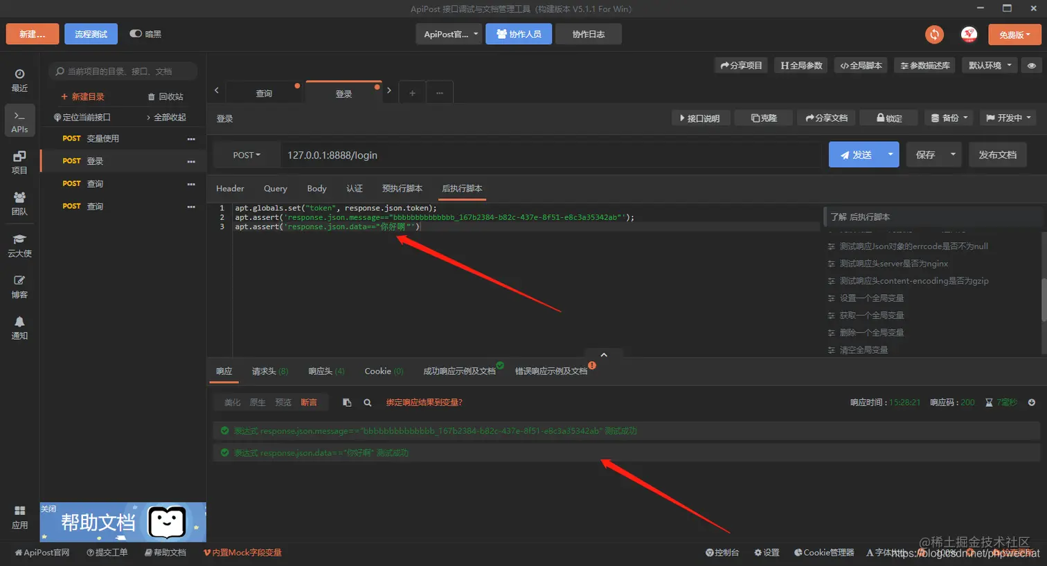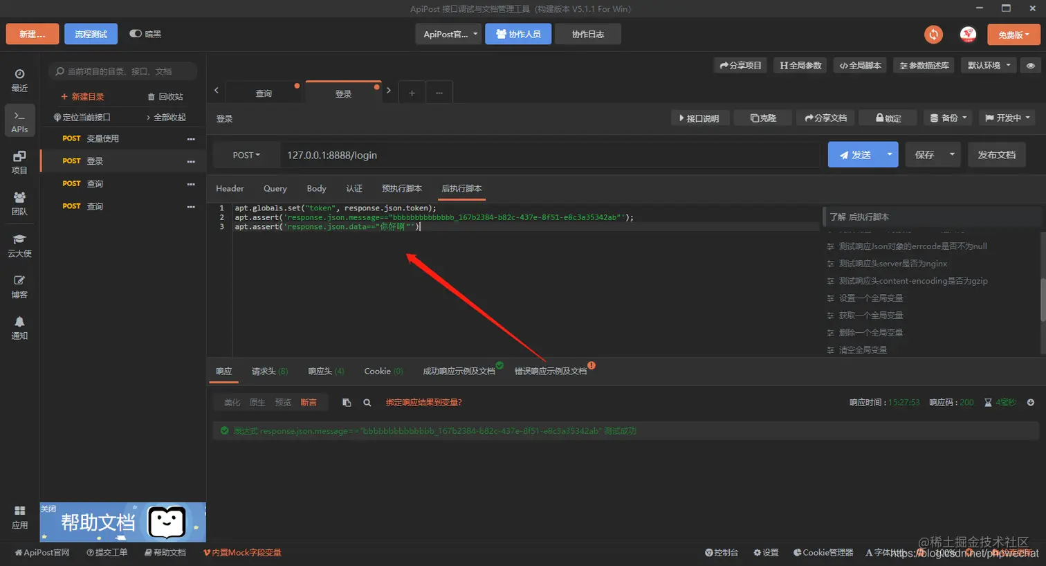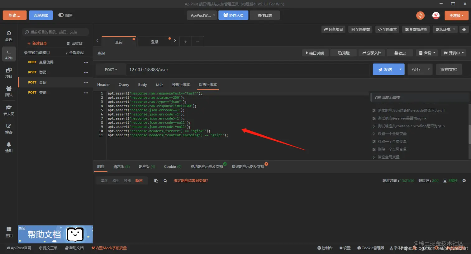接口测试的时候,有时候会对接口进行断言,apipost在后执行脚本中提供了断言功能