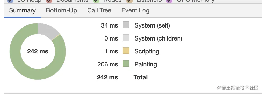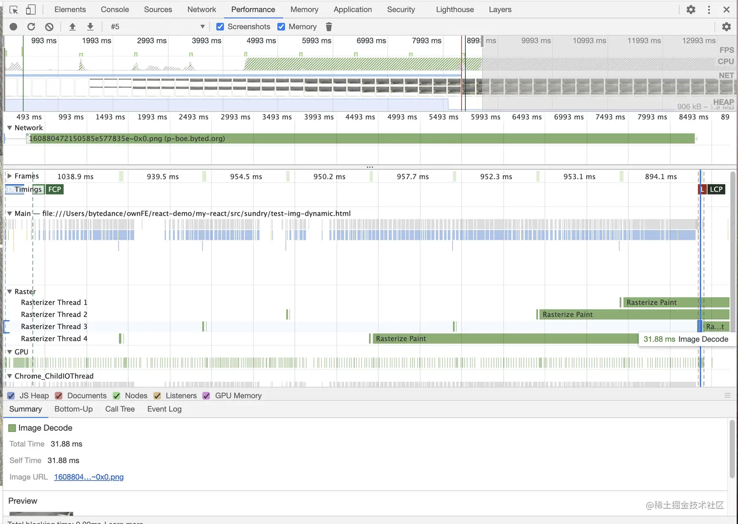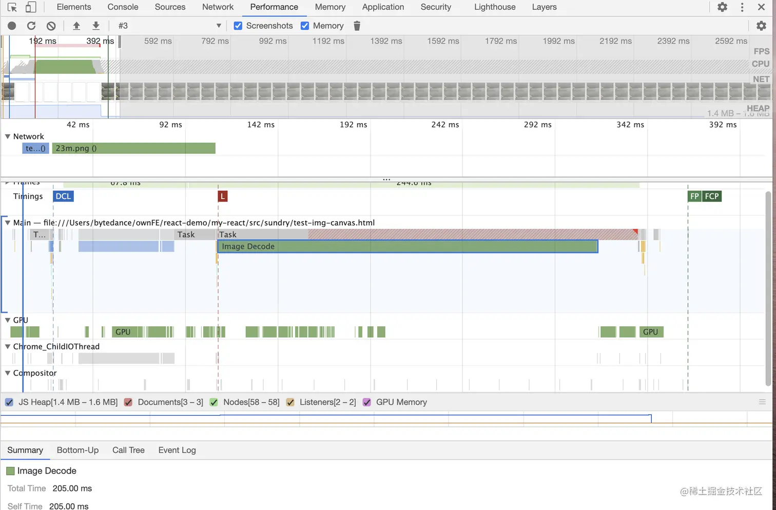 相比较之下,两者完整渲染出页面内容的时间并没有很大差异,由于图片尺寸很大,在解码上耗费了不少的时间,合理的优化图片格式和图片体积,对于图片的加载有着更加重要的意义。