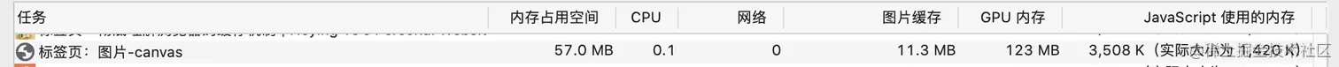 不论使用什么渲染方式,过了很长一段时间之后浏览器会回收掉部分图片缓存,根据缓存变换的大小来看,应该是将本身解码转化为二进制的图片数据清除掉了,只留下了未解码的图片数据,这个大小就近乎于本身图片的体积大小了。如下分别是使用canvas刚渲染完毕的图片缓存情况和过了一段时间之后的情况: