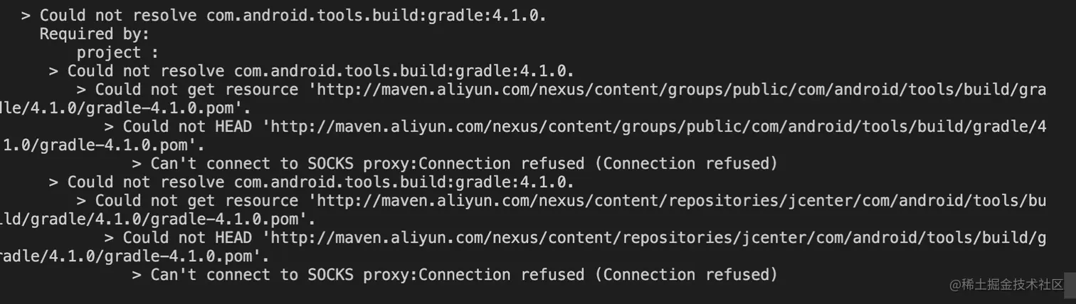 于是,我尝试使用国内的淘宝源、关闭sock、打开sock、升级Android studio到4.0,删除build文件。