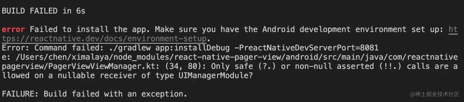 提示很简单,说react-native-pager-view最低sdk是17,而我的项目中最低sdk是16。我渐渐有了不详的预感。但是,没关系,修改一下我的项目中的minSdk版本也是很简单事情。
