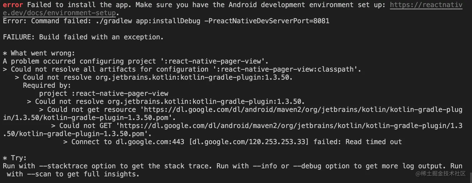 改完之后,我继续执行了一次yarn android。我先去喝了口水。回来之后,又一次报错了。