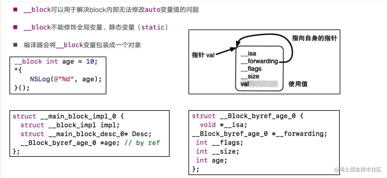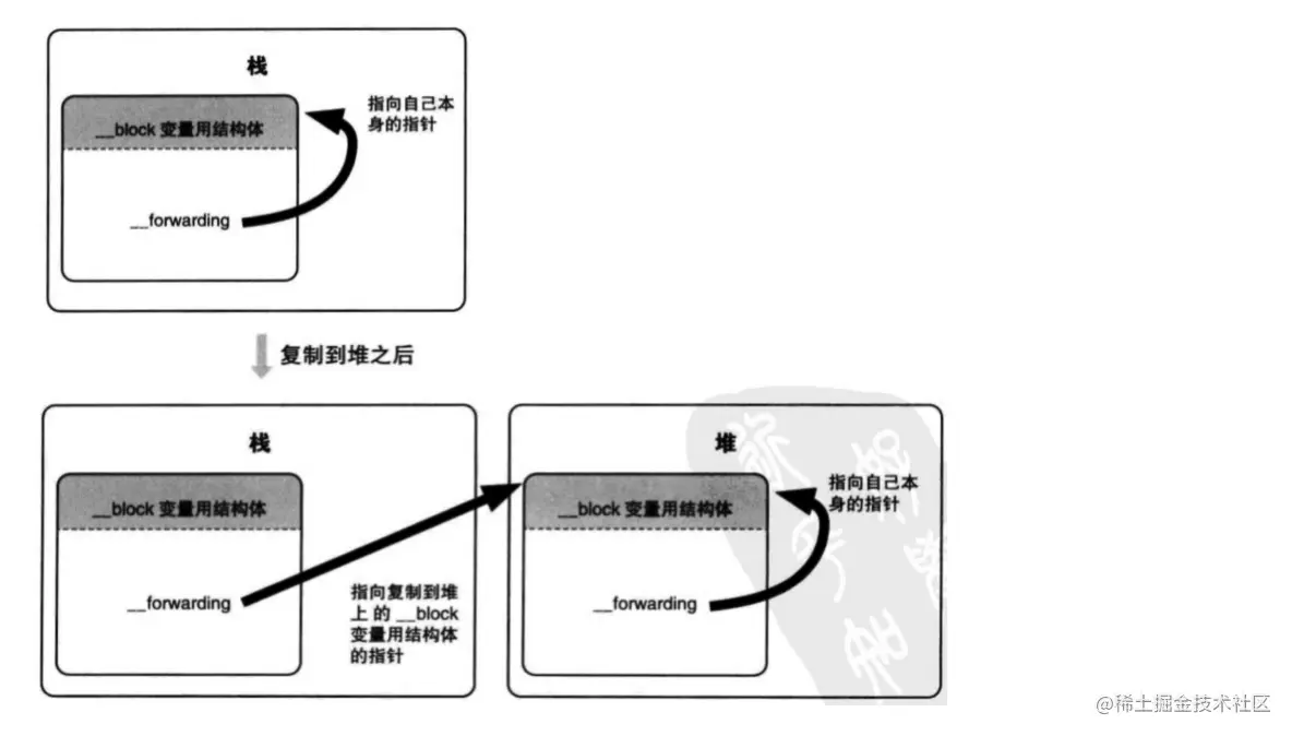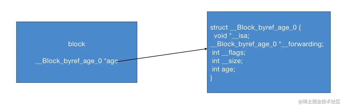 当block在栈上的时候,那__forwarding指针指向自己本身,如果block被拷贝到堆区,那么会通过栈上__forwarding指针指向堆区的block,而堆区block的__forwarding(就是自己)就能找到堆区的age值 -
