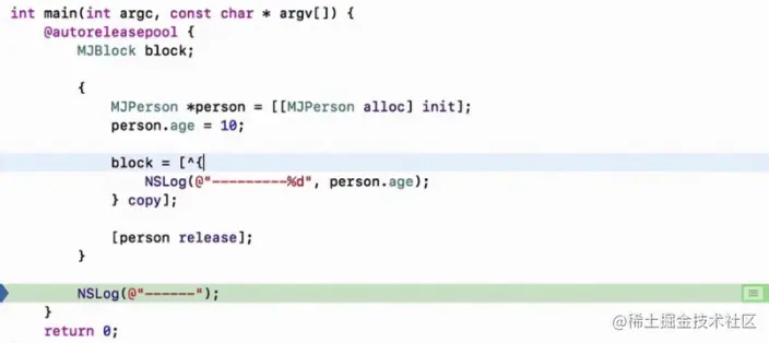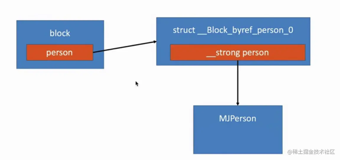 注意:MRC下在__block修饰对象的时候,对blocl进行copy后,堆上的person指针指向MJPerson的箭头始终是弱引用