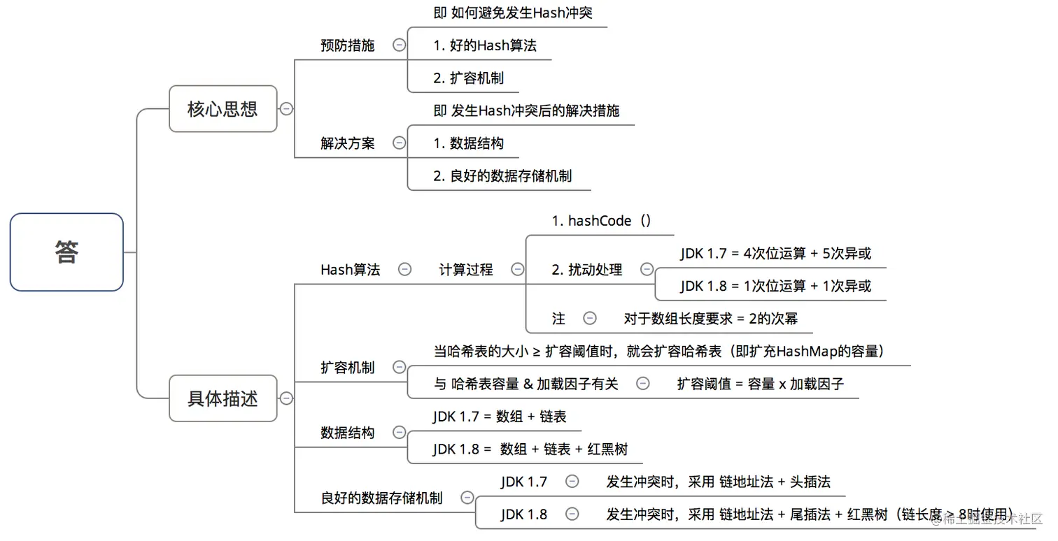 hash & (length-1)(这里就是为什么扩容的时候为啥一定必须是2的多少次幂的原因所在,因为如果只有2的n次幂的情况时最后一位二进制数才一定是1,这样能最大程度减少hash碰撞)(hash值 & length-1) - 而在JDK1.8的时候直接用了JDK1.7的时候计算的规律,也就是扩容前的原始位置+扩容的大小值=JDK1.8的计算方式,而不再是JDK1.7的那种异或的方法。但是这种方式就相当于只需要判断Hash值的新增参与运算的位是0还是1就直接迅速计算出了扩容后的储存方式。