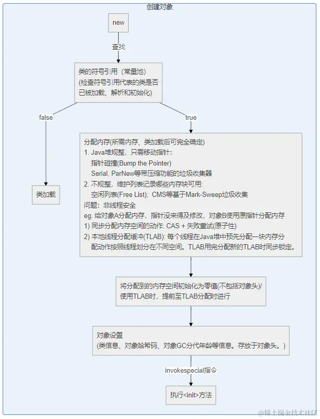 - 可能抛出的异常:OutOfMemoryError(堆中没有内存可以分配给新创建的实例,并且堆也无法再继续扩展了)。