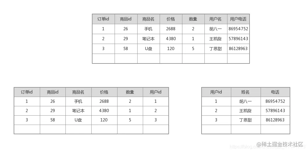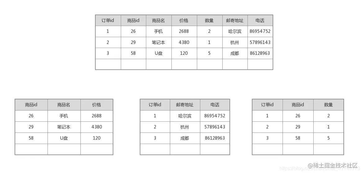 例如:订单表中需要有客户相关信息,在分离出客户表之后,订单表中只需要有一个用户id即可(外键),而不能有其他的客户信息。因为其他的客户信息直接关联于用户id,而不是直接与订单id直接相关。