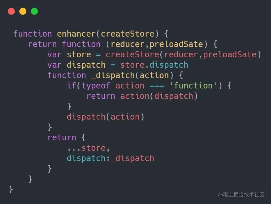所以 enhancer 的目的就是增加 dispatch 的功能。比如我们遇到异步代码,就可以传入 enhancer 了。