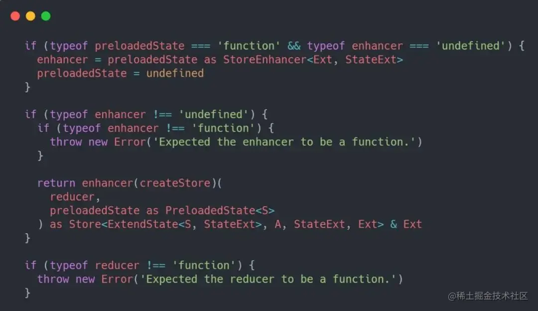 在 createStore 函数中,有关 enhancer 的代码就这么多,大致意思就是判断 enhancer 是否存在,是否是函数,并且对于 enhancer 的要求还必须返回一个函数。