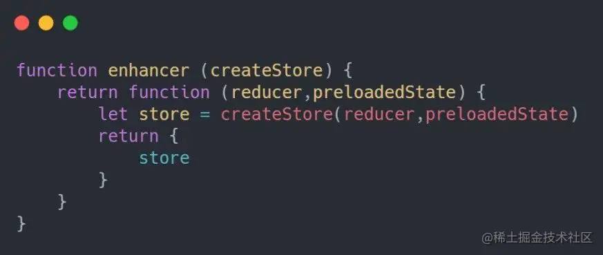也就是说,当我们传入第三个参数的时候,代码执行到这里就结束了,但是 createStore 要的是 store 对象,于是我们知道了 enhancer 返回的依然是一个 store 对象,只是这个 store 对象是增强后的 store。所以,新的 enhancer 结构如下: