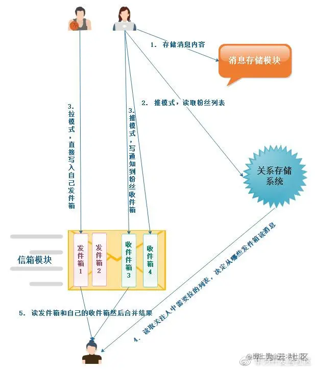 推拉模式结合:针对大多数用户的写入用推模式,特定用户采用拉模式,Feed消费者读取时分别读取自己的收件箱和特定用户的发件箱,合并之后展示。