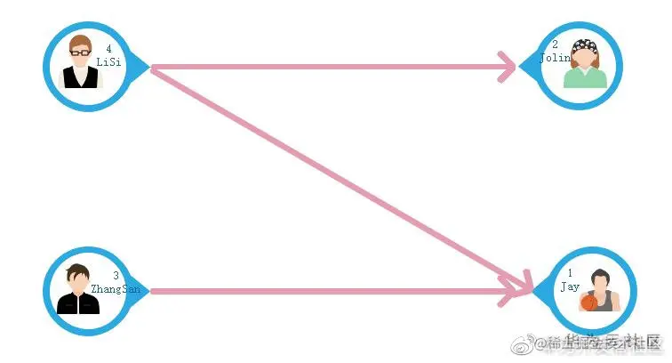 系统中存在四个用户,Jay、Jolin、ZhangSan、LiSi。其中ZhangSan、LiSi关注了Jay,LiSi同时关注了Jolin。