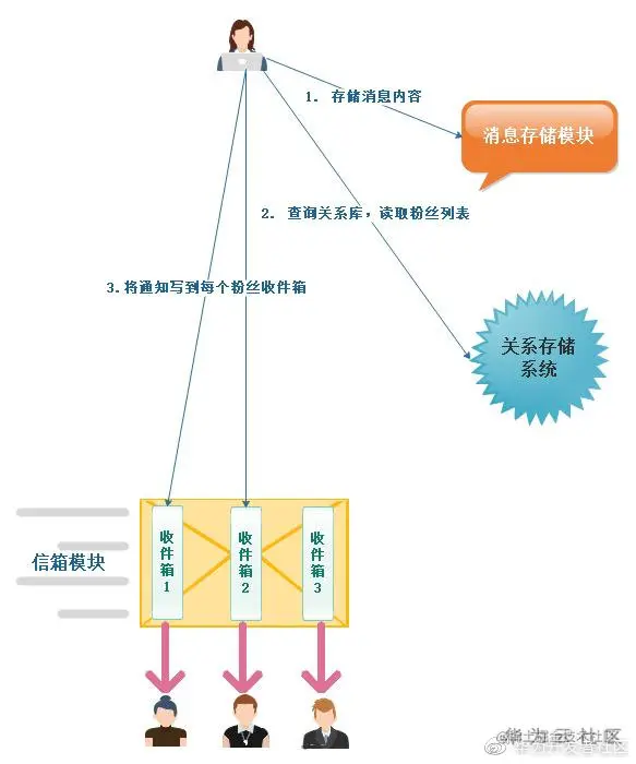 Feed生产者创作一条内容后发到Server端,Server端先将消息内容存储到消息存储模块,接着根据信箱模块的设计查询关系存储库将通知信息写入信箱模块, Feed消费者通过查询信箱获取及时消息。