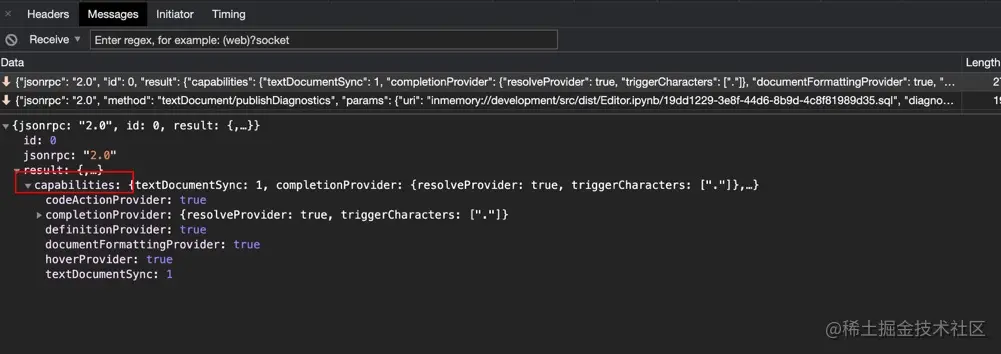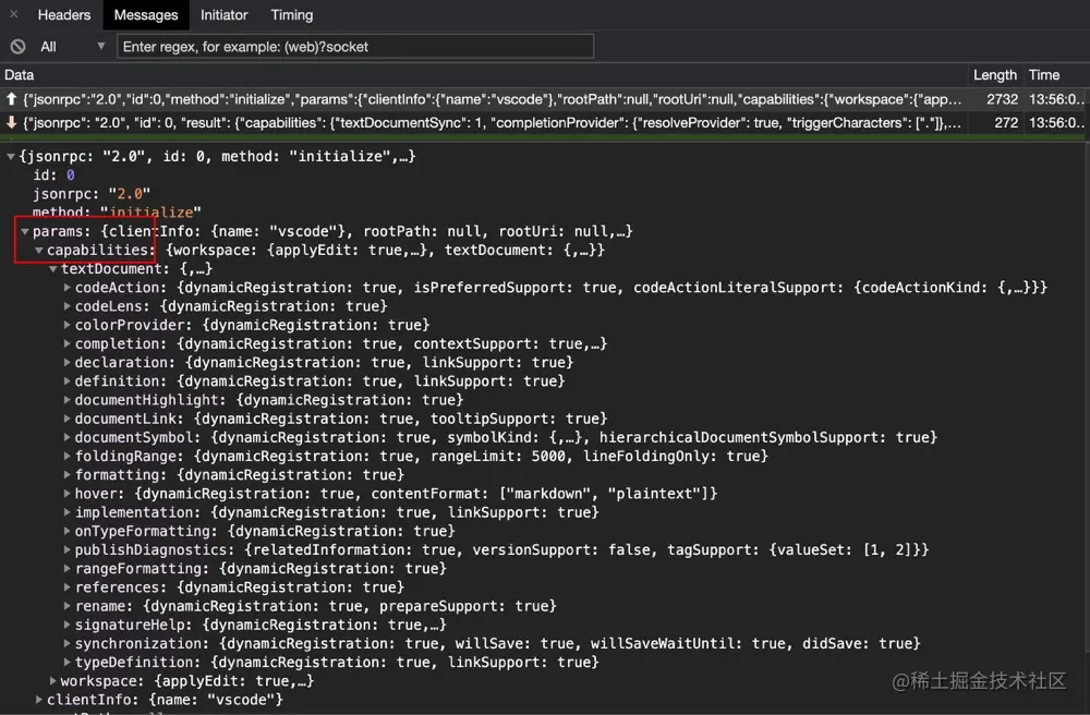 初始化消息, 消息中params.capabilities 规定了Client端支持的能力, 比如补全