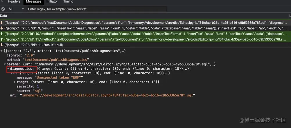 Server 也可以主动向 Client 推送事件,我这里的案例是服务端会主动发送diagnostics事件,在打开或change后发送语法诊断的结果, 诊断返回的内容是错误的文字所在位置,和错误提示,如下range 是起始和结束位置, message是消息内容