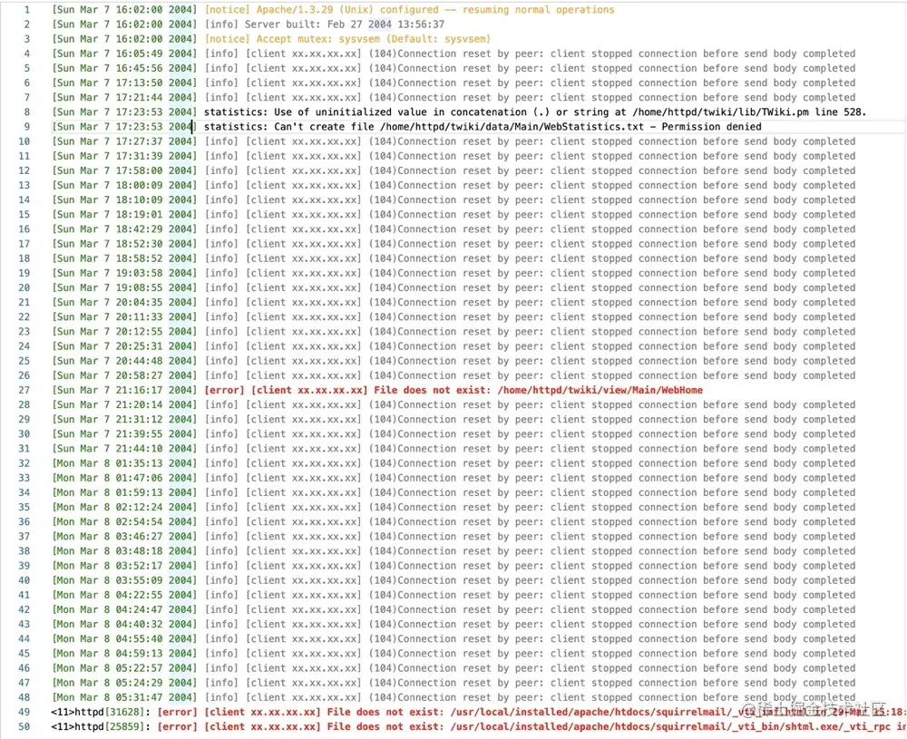[Sun Mar 7 21:16:17 2004] [error] [client xx.xx.xx.xx] File does not exist: /home/httpd/twiki/view/Main/WebHome