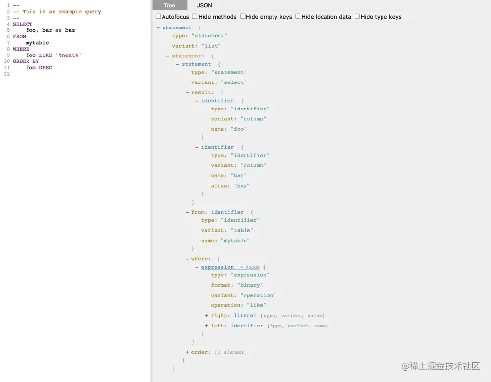 这个过程最关键的点在第二步,如何根据一段代码和其中的一个位置给出一系列智能提示。当然很多语言有现成的自动补全轮子,比如 Python 的 jedi。这里以 SQL 为例:简单来说,我们需要对一串 SQL 做词法分析和语法分析,以理解接下来可以写的代码是什么。这里的词法分析和语法分析,其实正是编译原理里编译器的“前端”的前半部分:词法分析是将代码切分成一个个词(Token),语法分析是对 Token 序列进行一系列定义的计算,以构建特定的数据结构。一般编译器进行语法分析后得到的产物是一颗抽象语法树(AST),并基于此继续进行语义分析并优化。一个标准SQL的AST树如下结构: