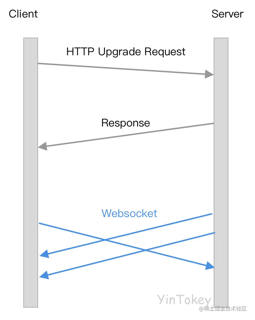 初始阶段客户端客户端发送 HTTP Upgrade Request,在 Request Header 中告知服务端将升级为 WebSocket。