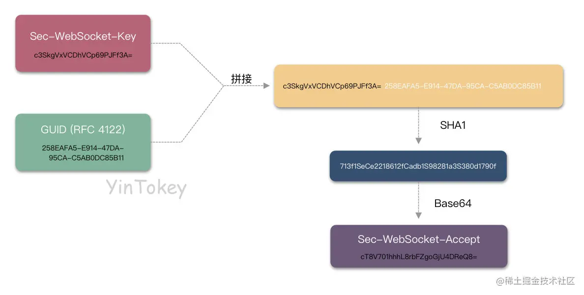 首先将 Sec-WebSocket-Key 和一个固定的字符串常量 GUID 拼接起来。
