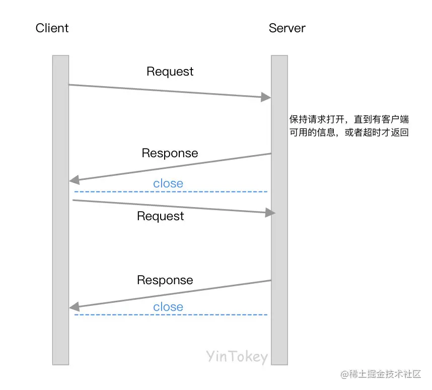 长轮询(long polling)则是基于轮询的另一种方案,它也被称为 Comet 或者反向 AJAX。服务端收到客户端请求后,会保持请求打开,直到有客户端可用的信息或者超时了,才返回可给客户端。这么处理相对于普通的轮询,优点是可以减少不必要的请求。但是当信息更新很频繁时,长轮询相对于普通轮询的优势就不再明显。