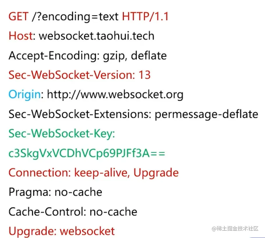 握手建立一开始由客户端发送一个 HTTP 请求,在 Header 中携带信息告知服务端升级为 WebSocket。其中红色和绿色为必选信息。