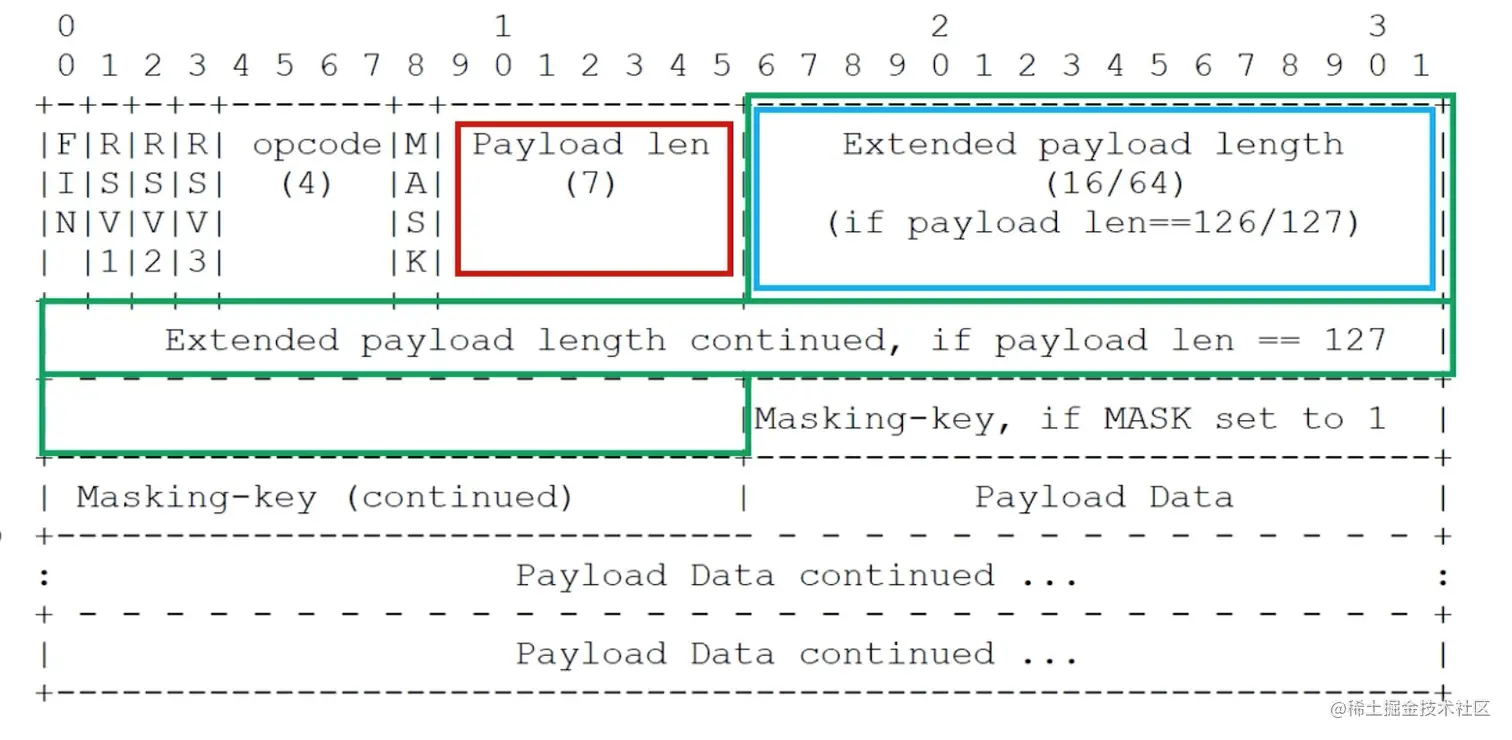 数据长度小于等于 125字节,则使用红色圈出的区域即可,剩余的 Extened payload不使用。