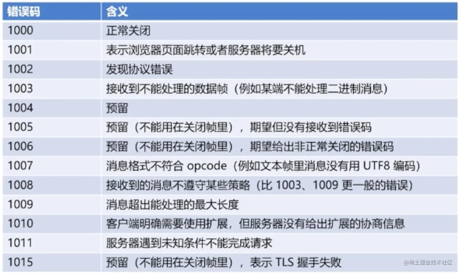 关闭帧的 payload 数据前2个字节可以表示关闭会话的原因。