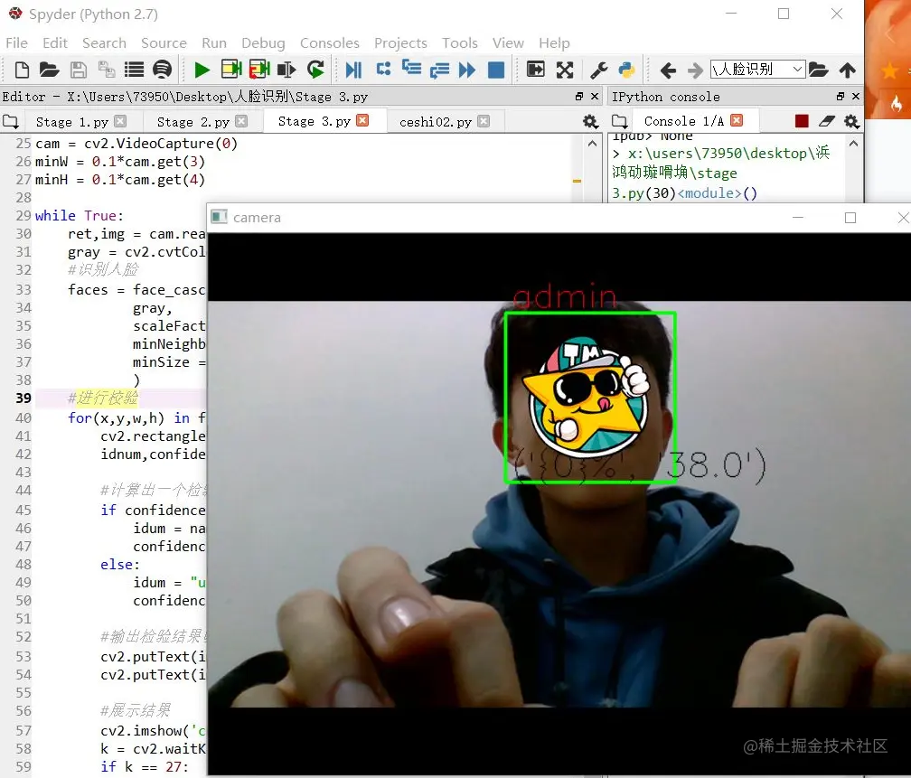 #检测人脸,将每一帧摄像头记录的数据带入OpenCv中,让Classifier判断人脸