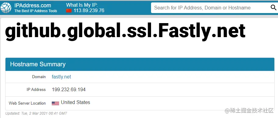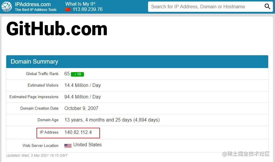 然后打开ipaddress.com,查询以下的域名,记录其ip: