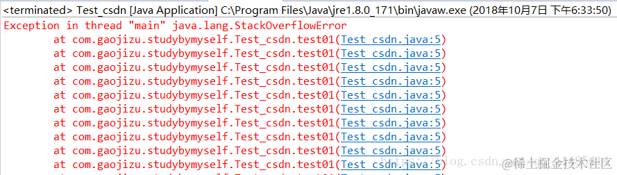 这里就很有意思了,代码走到这里01的时候他发现下面要执行的是test01,也就是自己,所以就直接回到方法头部开始重新执行,第二次还是自己,所以就陷入一个无限循环中,这里可能你们一看就明白,但是很少有人去思考这里的问题,这个情况会导致在我们计算机中有限的内存出现无限的数据,所以导致了内存溢出!可能很多人就说了,这不是和C语言中的Goto方法差不多嘛!虽然java中的goto已经不让用了,但是思想其实是差不多的,虽然不让用了但是我们还是可以在java中找到他的影子的,例如下面的代码: