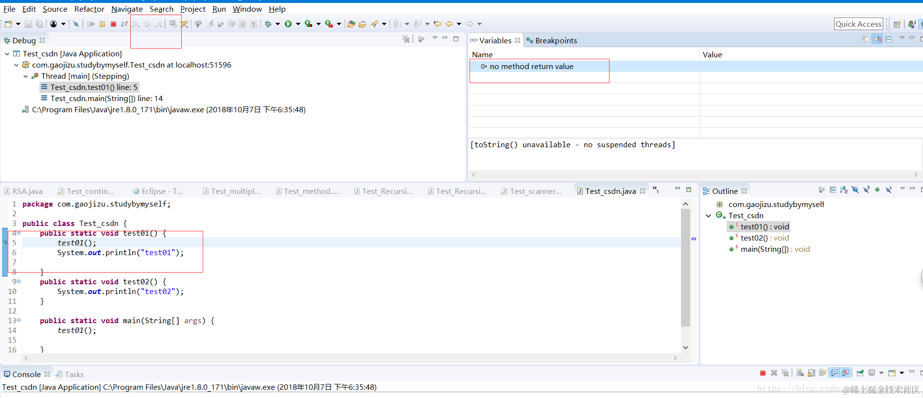 ok这里我们可以看到我写了两个方法,test01和test02,那么这里我们会想这个很简单的啊,函数从mian进入,执行01