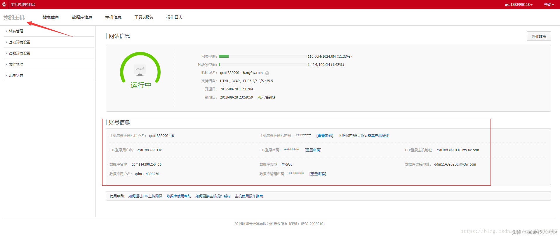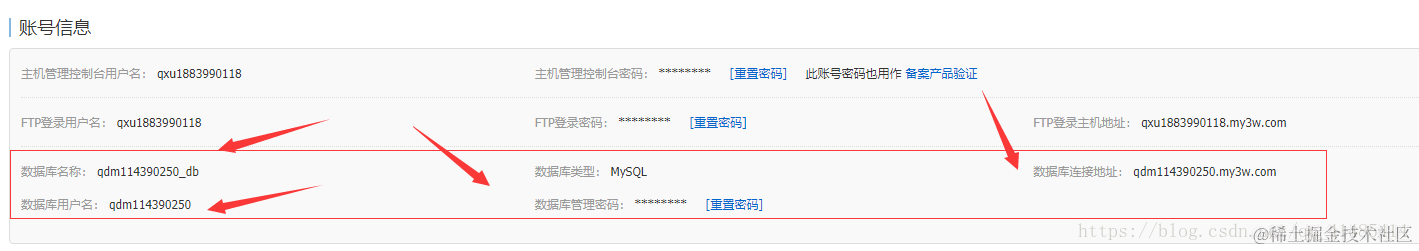 那么这里的数据库信息是怎么来的呢?我们再次打开自己的空间,查看一下自己的数据库信息: