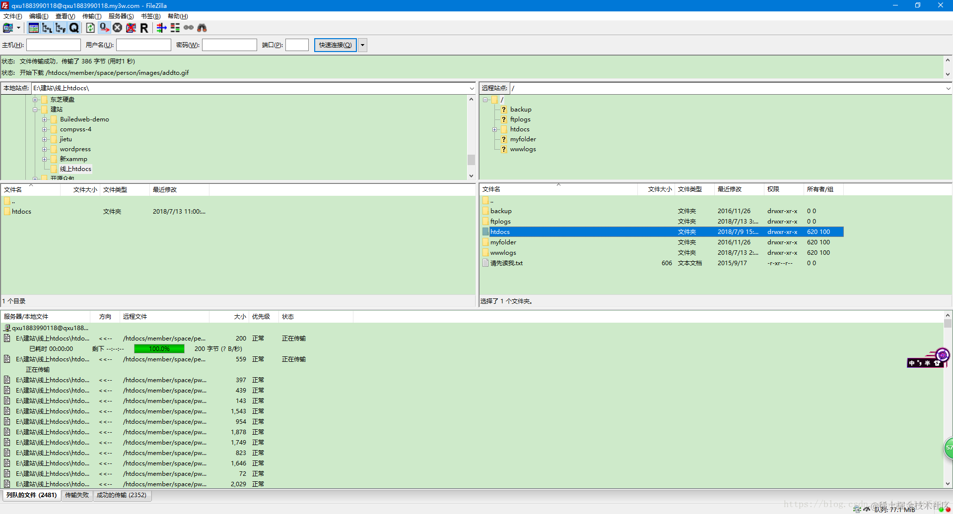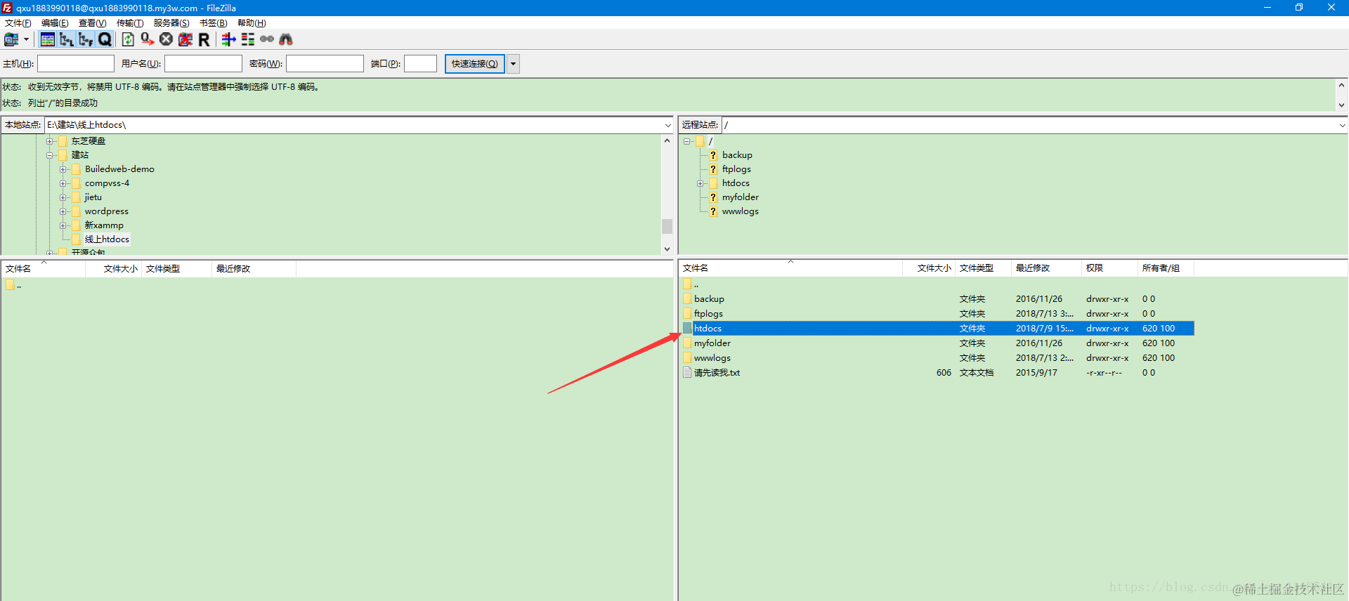 第三步:将本地的文件上传到FTP空间(这里只需要将HTDOCS文件夹下面的所有文件上传上去)