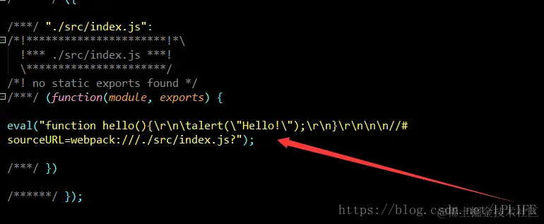然后去末尾看一下我们写的index.js被被放进去没有,从下图的代码可以看到已经包含进去了,说明我们打包成功了,为什么要做这一步呢,那当然是测试到底能不能进行打包了.