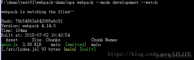 注意: 这个命令只是单纯监听了默认的打包路径,也就是能监听到src下index.js的变化,也能够随将变化时进行保存刷新后其自动打包,但是,并不能监听到demo.js. 还有就是你的执行这个命令的时候,它必需属于一直监听的状态, 如果被停止了,那监听状态也停止.\