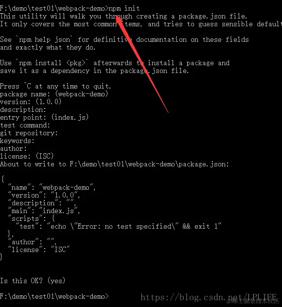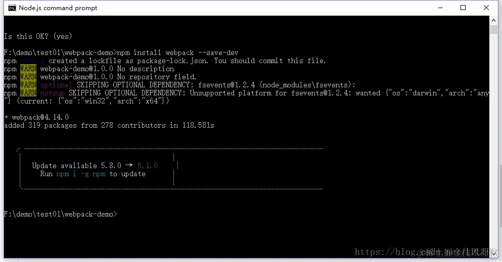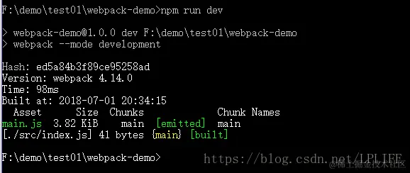 9.接下来,输入命令 webpack-demo,有些人奇怪,版本号怎么变了成4.14.0了,不好意思,我中途更新了,但是不要紧. \