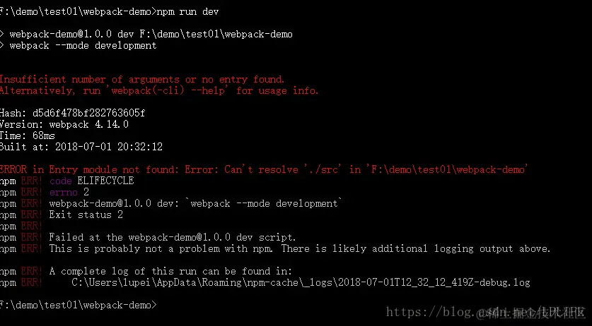 原因是,你输入命令 npm run dev 的时候,会默认打包src文件夹下的index.js文件,打包完成后是main.js文件(放在dist),你有没有发现我们一开始安装webpack的时候并没有这个文件生成,所以更别提什么index.js文件了,所以这些我们需要手动创建