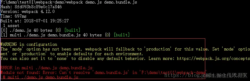 可以看到demo.js已经被打包为了demo.bundle.js文件,但是,这个并没有打包成功! 因为打包的时候没有出现红色的error了,但是还有黄色的警告.如下图.